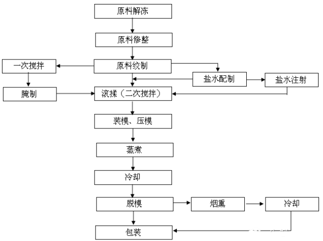 火腿類(lèi)(三明治、午餐火腿等)工藝流程:
